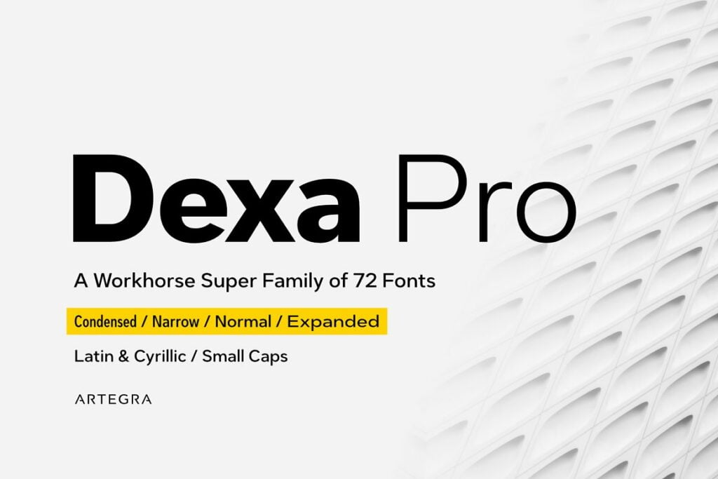 Dexa Pro was designed by Ceyhun Birinci in 2020 with an inspiration to create a contemporary super family with inspiration from classic sans serif families. It’s a workhorse family consisting of 72 fonts in condensed, narrow, normal and expanded widths. Each width has 18 fonts in thin to black weights, along with their true italic counterparts. With more than 770 glyphs per font, It offers a ton of language support from all the Latin languages to Cyrillic.